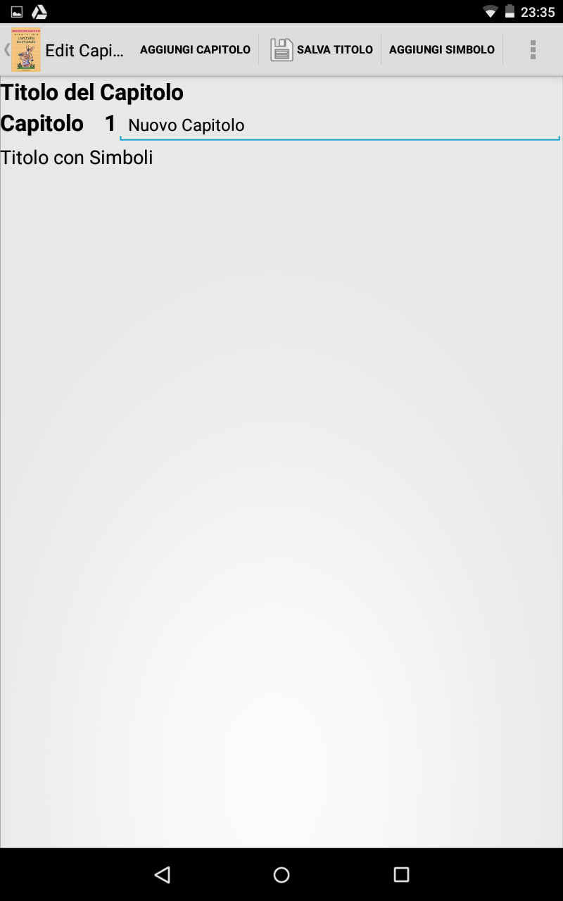 Il libro è suddiviso in capitoli. Per prima cosa quindi aggiungiamo un capitolo con la voce di menù AGGIUNGI CAPITOLO. Se apriamo quindi la tendina sulla sinistra tramite uno swype dal bordo sinistro verso il centro appare il capitolo appena creato. Seleziono il capitolo e iniziamo quindi nella fase di scrittura del titolo. Il menu ha le seguenti voci: