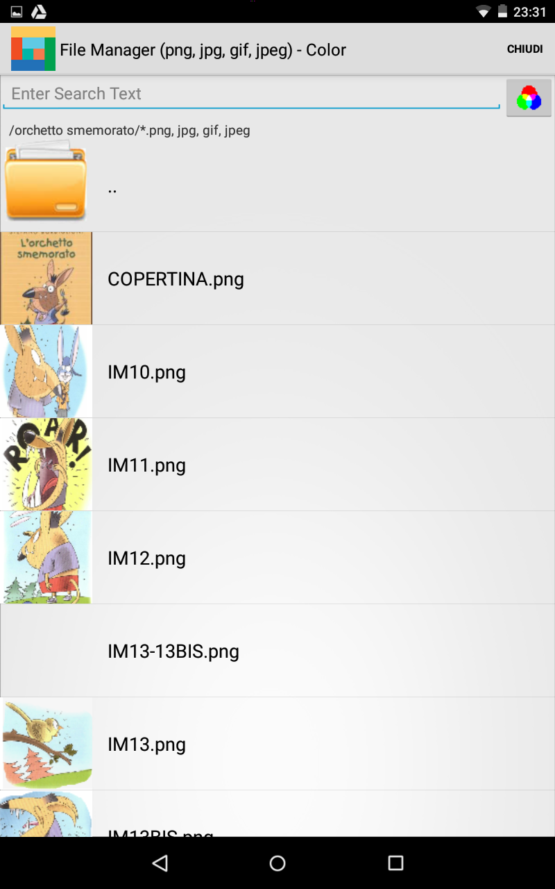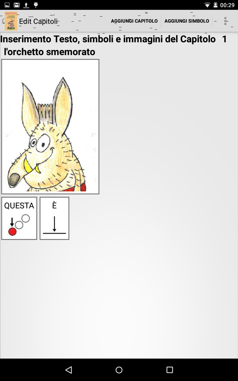 Raccogliete tutte le immagini che verranno utilizzate nel libro (scannerizzandole, creandole da voi se siete bravi, ricercando immagini libere su internet) che non fanno parte delle librerie ARASAAC in una cartella e trasferitele sul vostro tablet. Ad esempio avrete bisogno delle immagini dei protagonisti e delle immagini di contorno (che ho nominato "IMxx.png"). Nel mio tablet ho trasferito quindi la cartella "orchetto smemorato" che contiene tutte le immagini.