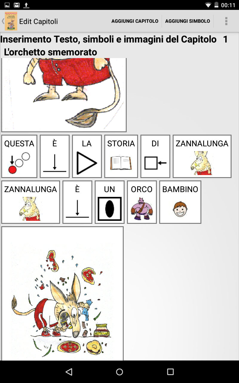 Identificate la storia e traducetela in simboli su carta, ovvero con carta e penna. Per semplicità sono partito da un libro messo a disposizione dalla scuola Don Milani di Prato realizzato da Lucia Chirici. Tutte questa parte ovvero quella di tradurre una storia in simboli semplificando il testo, scegliere le immagini dei personaggi, scegliere immagini di contorno e realizzare la storia vera e propria, in realtà è quella più complessa. Se è per uso personale, l'ideale è partire da libri in simboli o standard ed utilizzare le immagini del libro stesso, altrimenti dovreste avere il consenso dell'autore o della casa editrice o, se siete bravi, realizzate i disegni dei personaggi da voi e/o utilizzate immagini libere da eventuali diritti. Finita questa fase ho quindi su carta( stampata o scritta a mano) uno storyboard su cui basarmi durante la creazione.