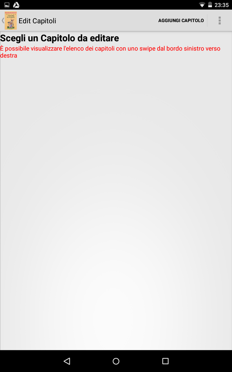 Il libro è suddiviso in capitoli. Per prima cosa quindi aggiungiamo un capitolo con la voce di menù AGGIUNGI CAPITOLO. Se apriamo quindi la tendina sulla sinistra tramite uno swype dal bordo sinistro verso il centro appare il capitolo appena creato. Seleziono il capitolo e iniziamo quindi nella fase di scrittura del titolo. Il menu ha le seguenti voci: